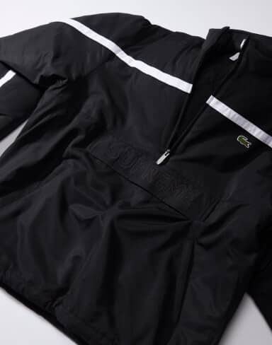 The baseline outlines the crocodile style. White lines from the tennis court sign the Lacoste look with a graphic stripe. The piping, printed or in a white braid version, underlines the structure of the garment.