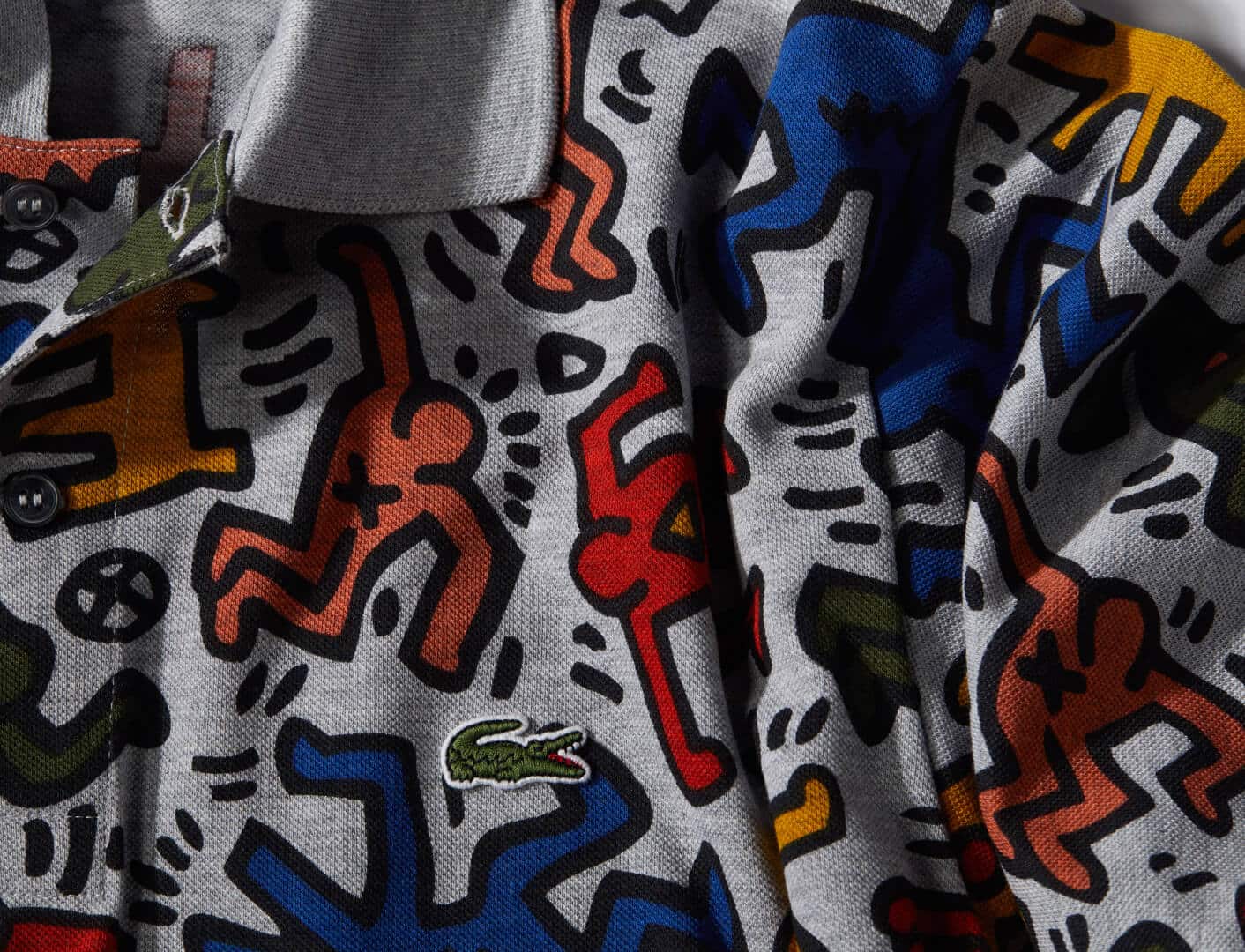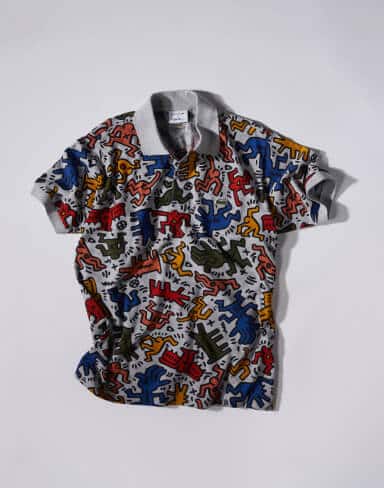 2019. Polos, shirts, dresses, sneakers, watches... Keith Haring's mythical characters mingle with the crocodile. And even the kids are dressed in this instantly recognisable 80's street art.