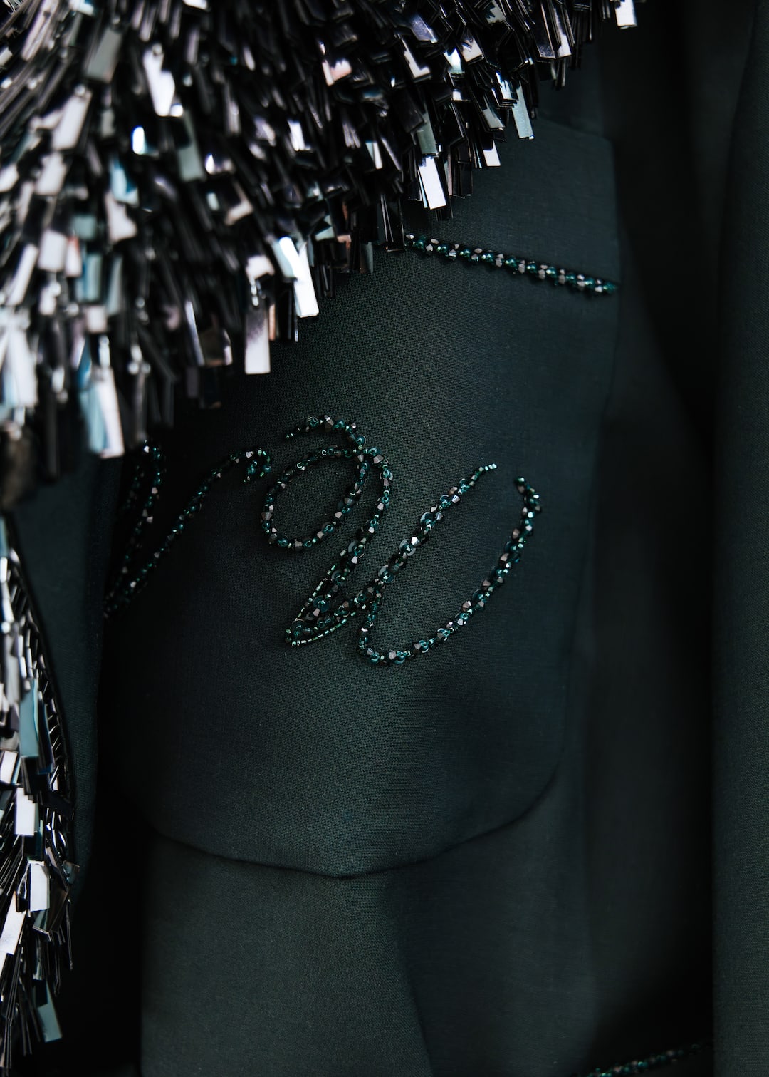 The two pieces are enveloped by a dramatic robe-inspired coat, 10,000 reflective micro-metal squares embroidered on the shawl collar and cuff capturing the night life of the Roaring 1920’s . Voluminous and sculptural, it blends technical materials with the timeless and joyous elegance of the dandy silhouette. A true work of art, the ensemble demanded over 1,000 hours of craftsmanship, 18,000 seed beads, 54,000 sequins, and 36,000 microtubes. As a final touch, Venus Williams’ initials (VW) were hand-embroidered on the chest of the robe. Completing the full dandy inspired look are heels trimmed with leather pleats along the outsole with encrusted crystals beads and a minaudière bag completed the look.